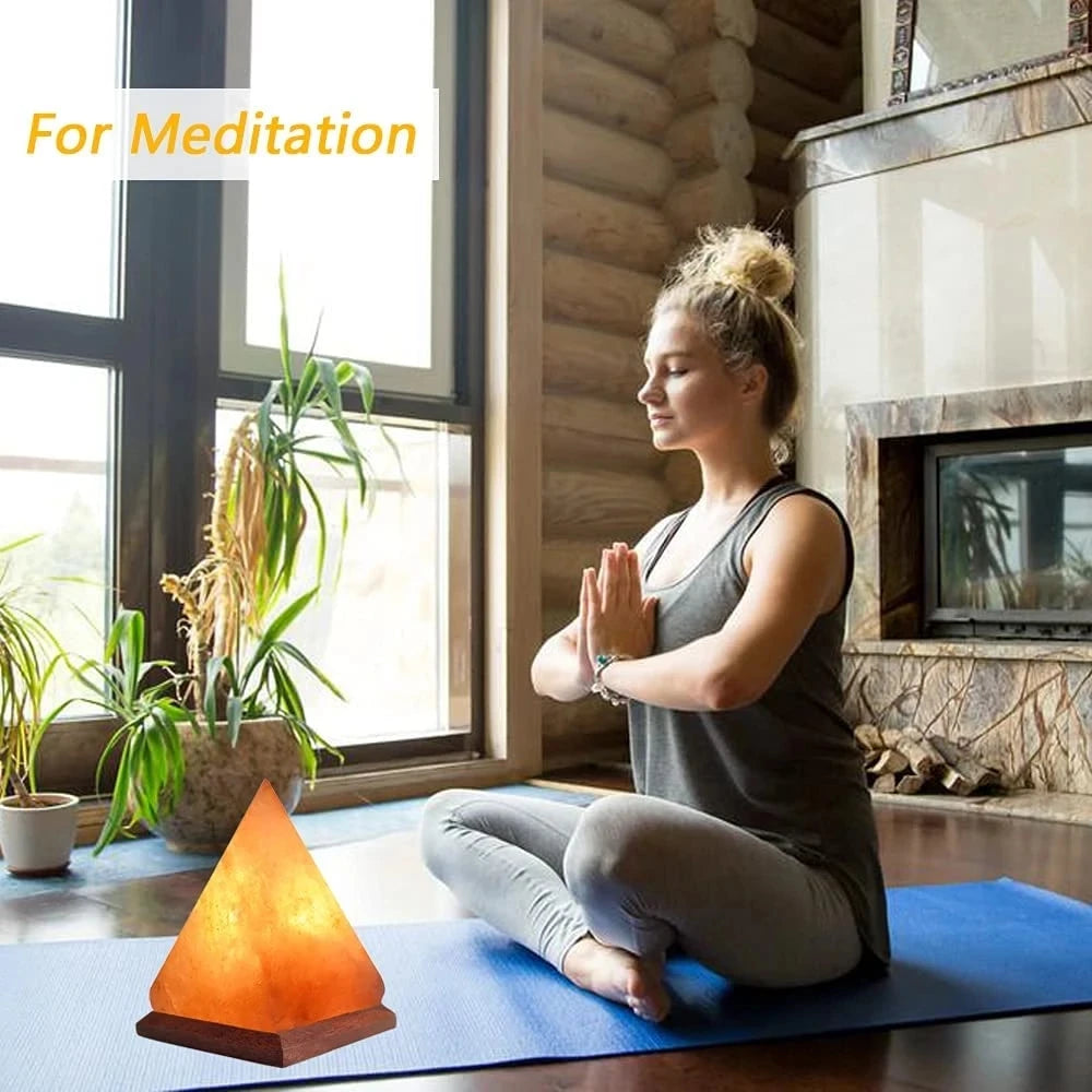 Lámpara de sal del Himalaya de diseño piramidal tallada a mano, con base de madera auténtica y bombilla LED multicolor alimentada por USB.