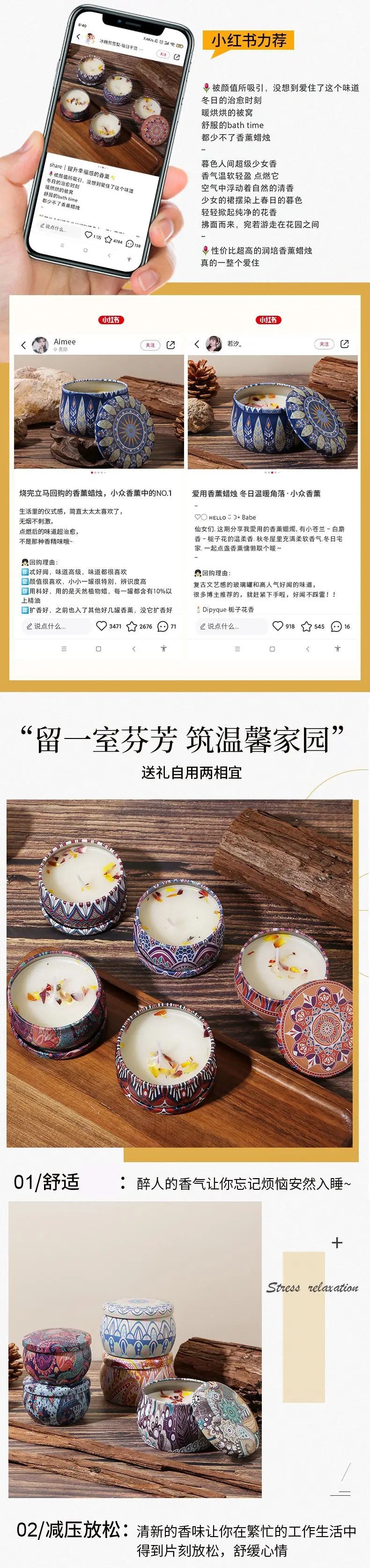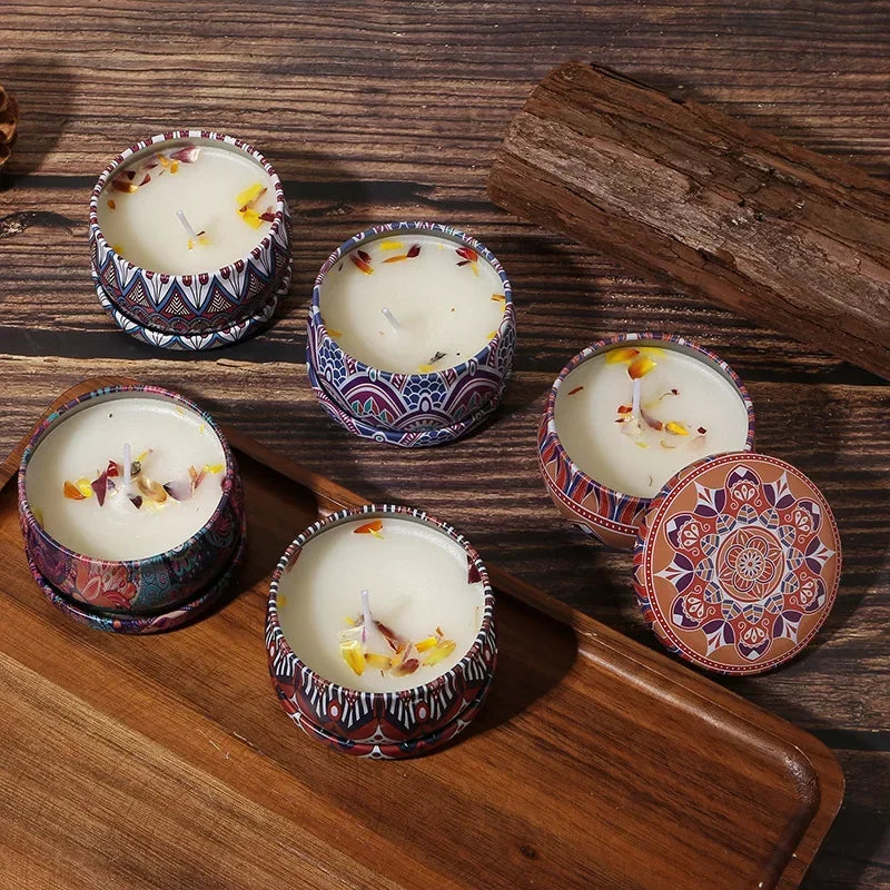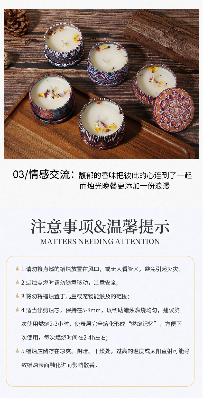 Esta vela artesanal de cera de soja, presentada en una lata de hierro con estilo étnico retro, es perfecta para aromaterapia y decoración en dormitorios o salas de estar.